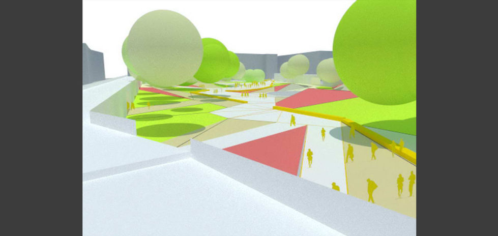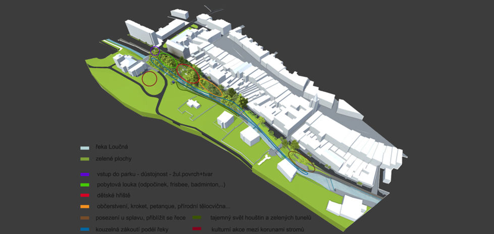 Koncept se snaží zachovat co největší míru zeleně vytvářející v městském prostředí, příjemné klima a stinná místa pro relaxaci. I proto v jížní části území, tedy v místě s největší mírou zeleně, jsou umístěny volnočasové aktivity. V severní části je ponechán kulturní a komerční ráz.