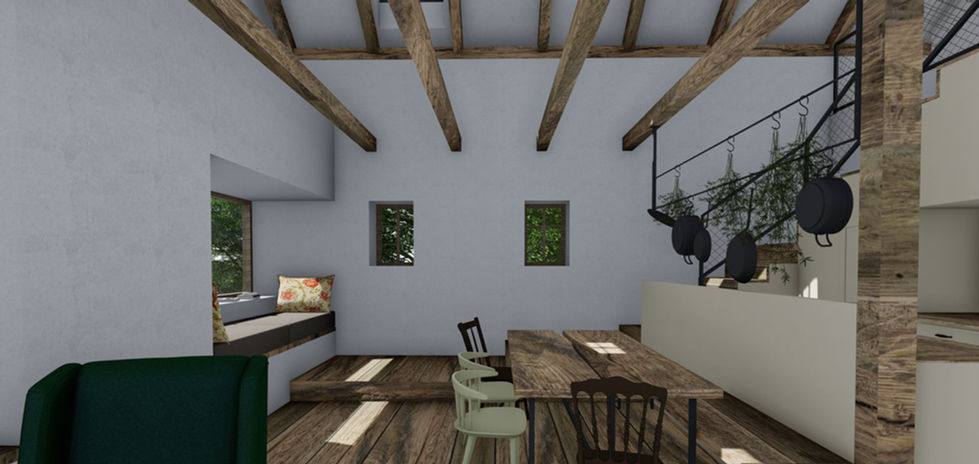 Ve vstupní části 1NP se nachází zádveří, technická místnost, vstup do pokoje a koupelna. Hlavní dveře z chodby Vás přivedou do světa obytné části, kde se můžete zhluboka nadechnout díky otevřenému prostoru, který sahá až do štítu.